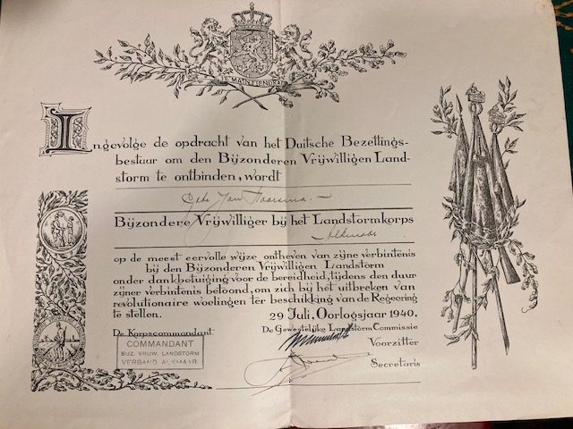 Minouk van der Plas – Haarsma stuurde na lezen van dit artikel de oorkonde die haar vader Wieringermeerder Gabe Jan Haarsma op 29 juli 1940 ontving. De tekst luidt: “Ingevolgde de opdracht van het Duitsche Bezettingsbestuur om den Bijzonderen Vrijwilligen Landstorm te ontbinden, wordt … Gabe Jan Haarsma … Bijzondere Vrijwilliger bij het Landstormkorps Alkmaar op de meest eervolle wijze ontheven van zijne verbintenis (…) onder dankbetuiging voor de bereidheid betoond om zich bij het uitbreken van revolutionaire woelingen ter beschikking van de Regeering te stellen.” Ondertekend door de Gewestelijke Landstormcommissie Noord-Holland en de commandant van het District Alkmaar.