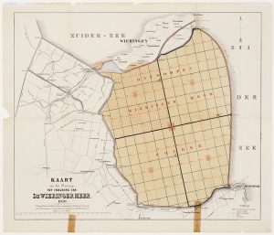 “Kaart van het Ontwerp tot indijking van de Wieringermeer. 1870.” Carthograaf R. de Vries. RAA, PR1005081. Het huidige Balgzand lag in de toenmalige Zuiderzee.