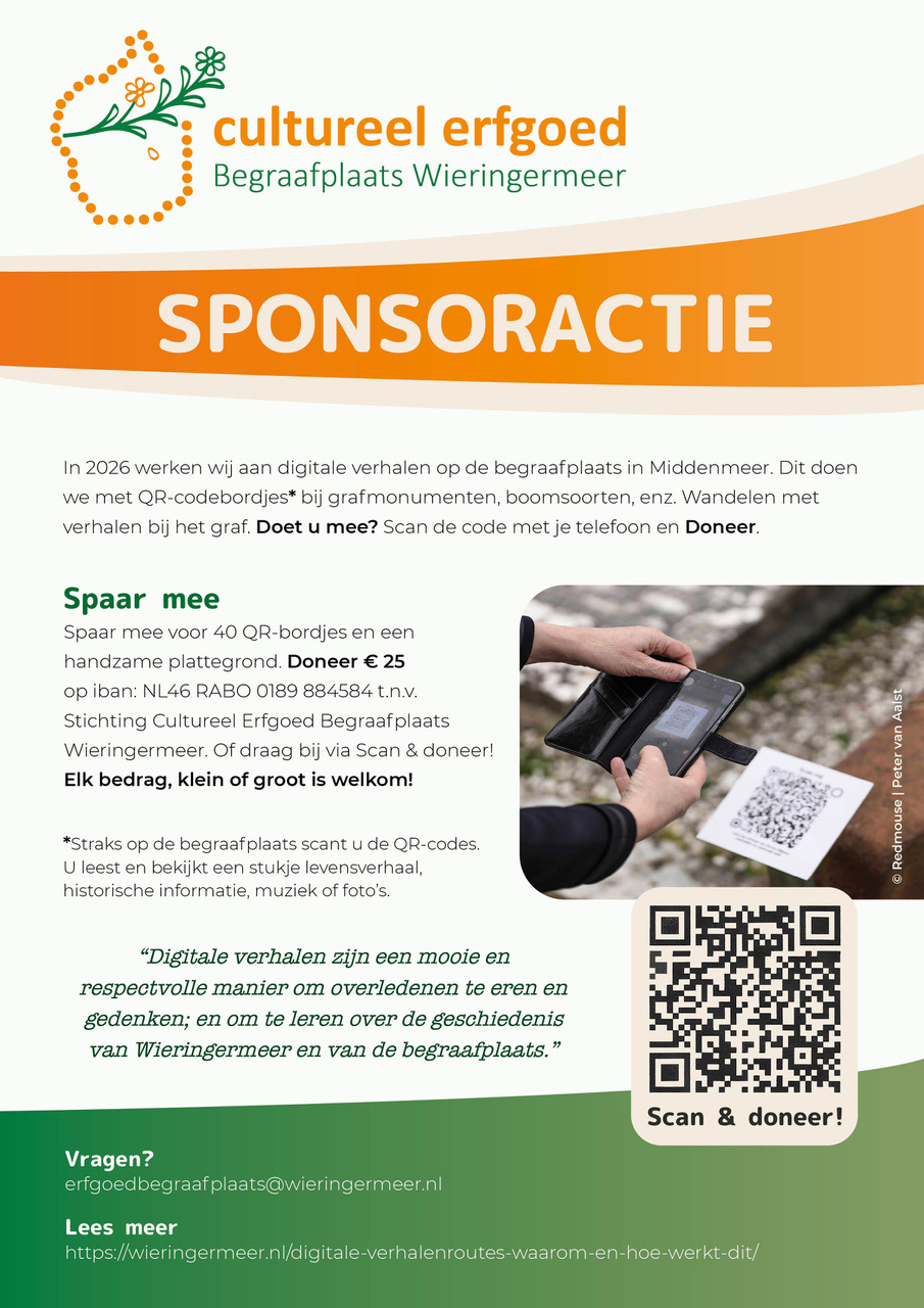Wieringerwerf, 20 januari – In 2026 werken wij aan digitale verhalen op de begraafplaats in Middenmeer. Dit doen we met QR-codebordjes bij grafmonumenten, boomsoorten, enz. Najaar 2026 kunt u de codebordjes tegenkomen. Wandelen met verhalen bij het graf. Doet u mee? Scan de QR-code op onderstaande flyer met je telefoon en doneer.