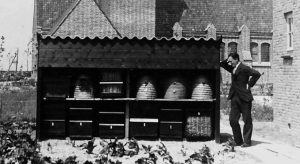Onderwijzer Vergouwen bij zijn bijenkorven en -kasten naast de Wieringermeerschool in 1934.